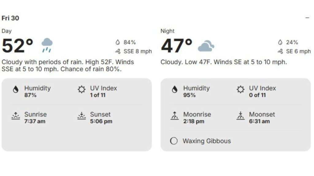 Overall, Friday’s weather favors indoor plans or short outings with proper rain gear.