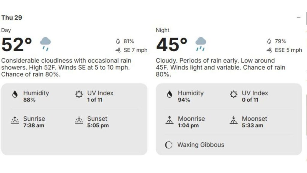 Nighttime humidity will climb even higher, approaching 94 percent, which may contribute to misty conditions and reduced visibility in some areas.