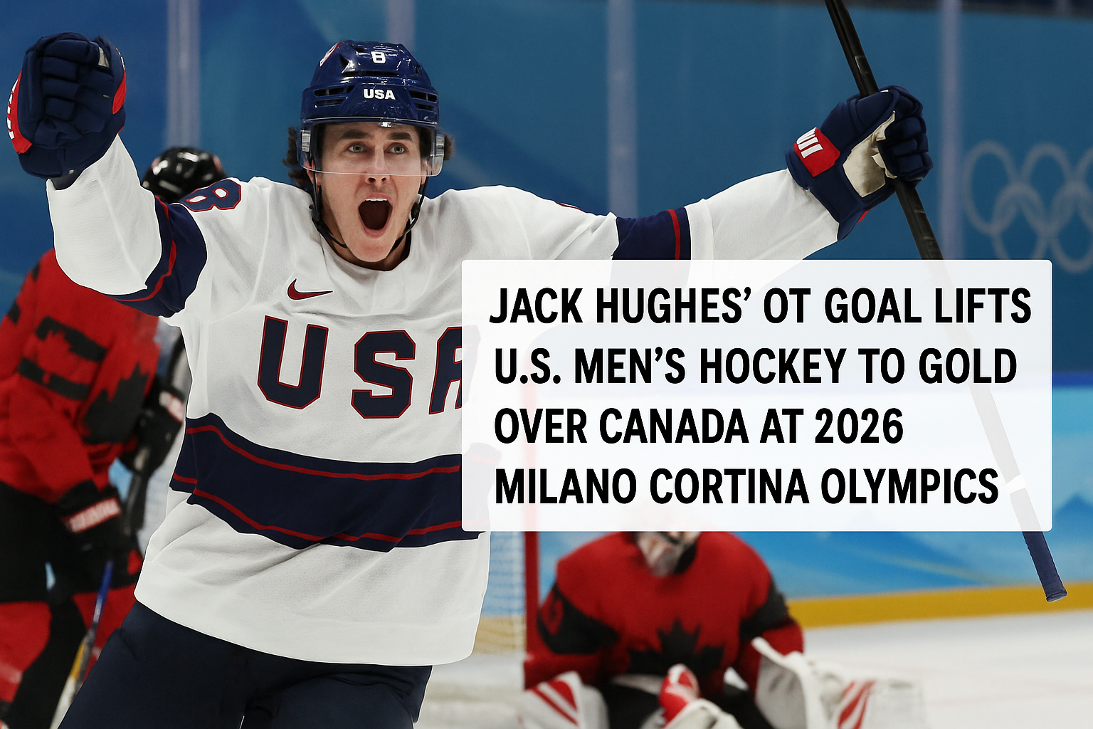 Feb. 22, 2026 — Milano Cortina, Italy — Jack Hughes scored 1:41 into 3-on-3 overtime to lead the United States men’s ice hockey team to a 2-1 victory over Canada in the gold medal final at the Milano Cortina 2026 Winter Olympics, securing the Americans’ first title in the event since the 1980 “Miracle on Ice”, exactly 46 years prior.