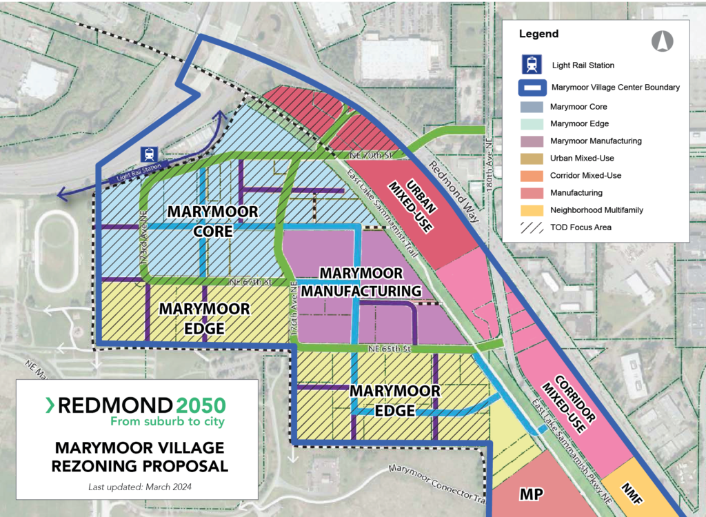 The revisions consolidate zones into Marymoor Core, Edge, and Manufacturing categories to facilitate mixed-use housing, employment, entertainment, and services.