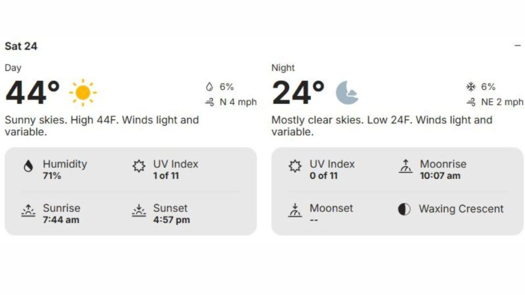 Sunrise is expected to occur at 7:44 a.m. During the day, the temperature will reach around 44 degrees Fahrenheit, slightly cooler than on Friday, January 23, 2026.