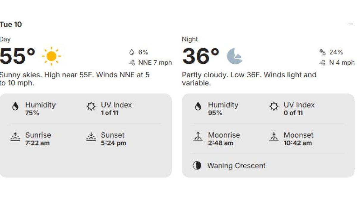 Astronomical conditions on Tuesday include a waning crescent moon, which will rise at 2:48 a.m. and set later in the morning to 10:42 a.m.