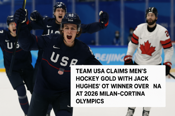 Feb. 22, 2026 — Milan-Cortina, Italy — The United States men’s ice hockey team defeated Canada 2-1 in overtime to win gold at the 2026 Winter Olympics, marking the program’s first title since the 1980 “Miracle on Ice.” Jack Hughes scored the game-winning goal at 1:41 of overtime off a pass from Zach Werenski, as reported by NHL.com and Olympics.com.