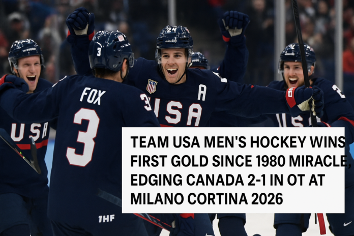February 22, 2026 — Milano Santagiulia Ice Hockey Arena, Milano, Italy — Team USA’s men’s ice hockey team captured its first Olympic gold medal since the 1980 “Miracle on Ice” by defeating Canada 2-1 in overtime during the gold medal game at the Milano Cortina 2026 Winter Olympics.