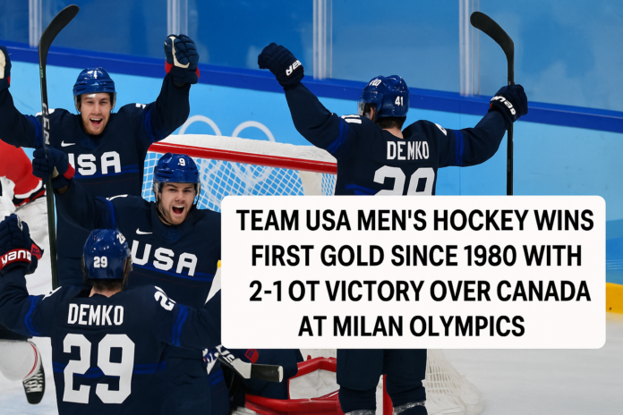 Feb. 23, 2026 — Milano-Cortina, Italy — The United States men’s ice hockey team defeated Canada 2-1 in overtime on February 22 at the Milan Cortina 2026 Winter Olympics, securing their first gold medal in the event since the 1980 “Miracle on Ice.”Olympics.comNHL.com