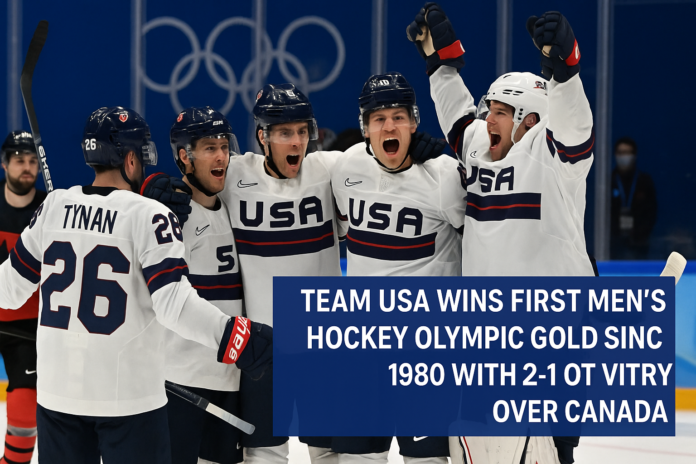 Feb. 22, 2026 — Cortina d’Ampezzo, Italy — Team USA’s men’s ice hockey team captured its first Olympic gold medal since the 1980 “Miracle on Ice” by defeating Canada 2-1 in overtime in the gold medal game at the Milan-Cortina Winter Olympics, with Jack Hughes scoring the game-winner just 1:41 into the extra frame.