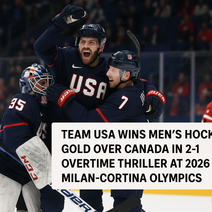 Feb. 22, 2026 — Milan-Cortina, Italy — Team USA defeated Canada 2-1 in overtime to claim the men’s ice hockey gold medal at the Winter Olympics, ending a 46-year championship drought since the 1980 ‘Miracle on Ice.’