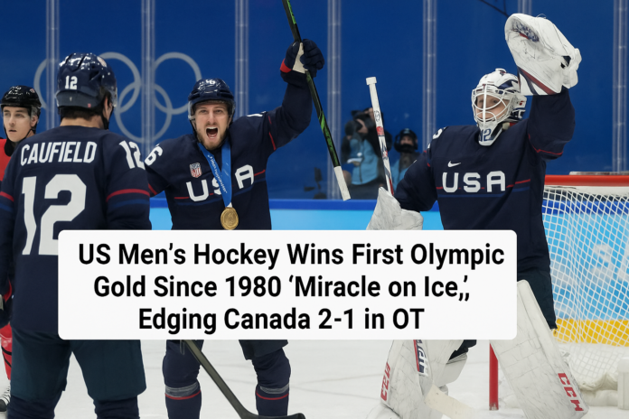 Feb. 22, 2026 — Milano Cortina, Italy The United States men’s ice hockey team defeated Canada 2-1 in overtime to claim the gold medal at the 2026 Milano Cortina Winter Olympics, securing their first title in men’s hockey since the 1980 “Miracle on Ice.” Jack Hughes scored the game-winning goal 1:41 into overtime, with goaltender Connor Hellebuyck recording 41 saves.